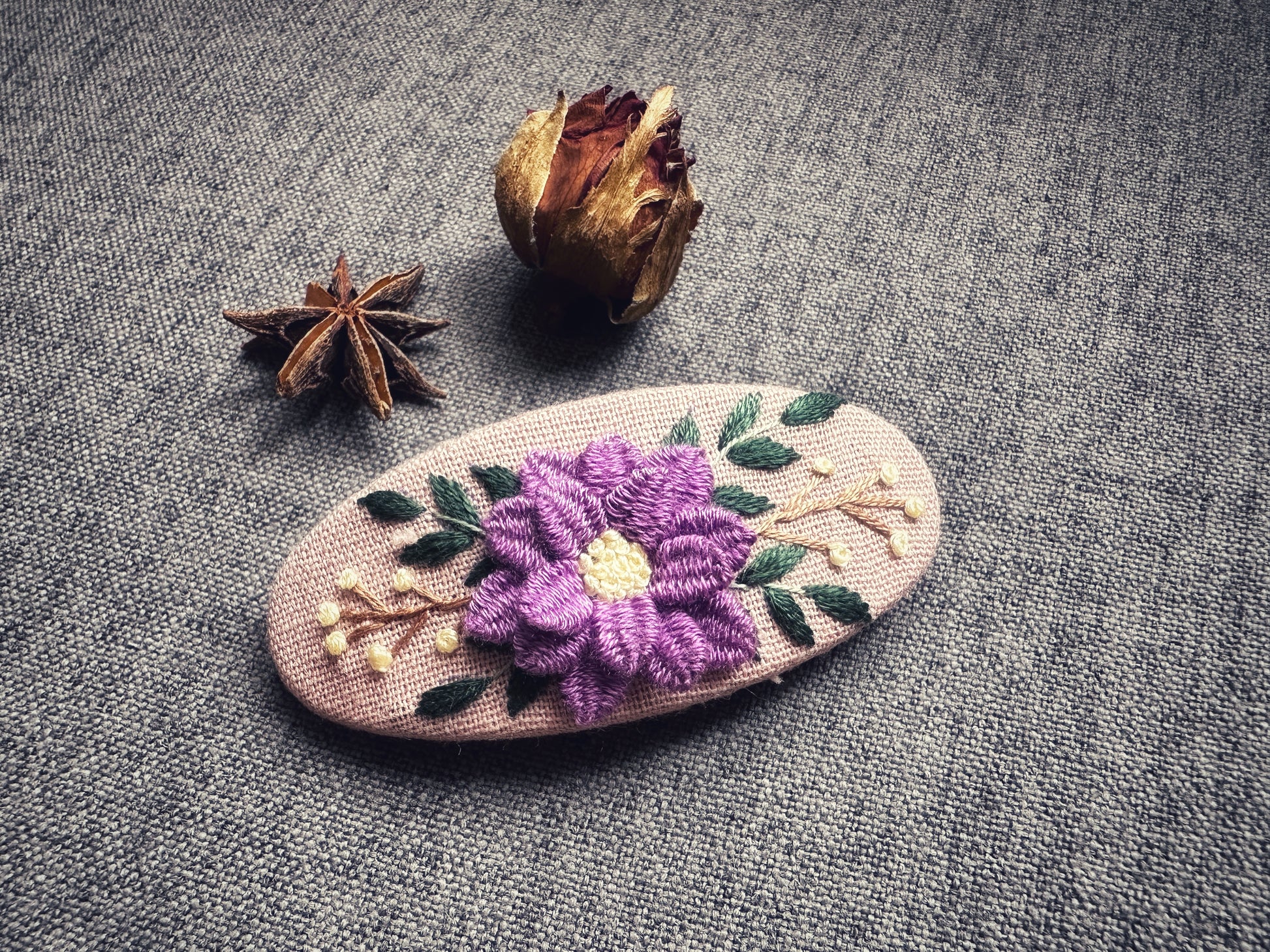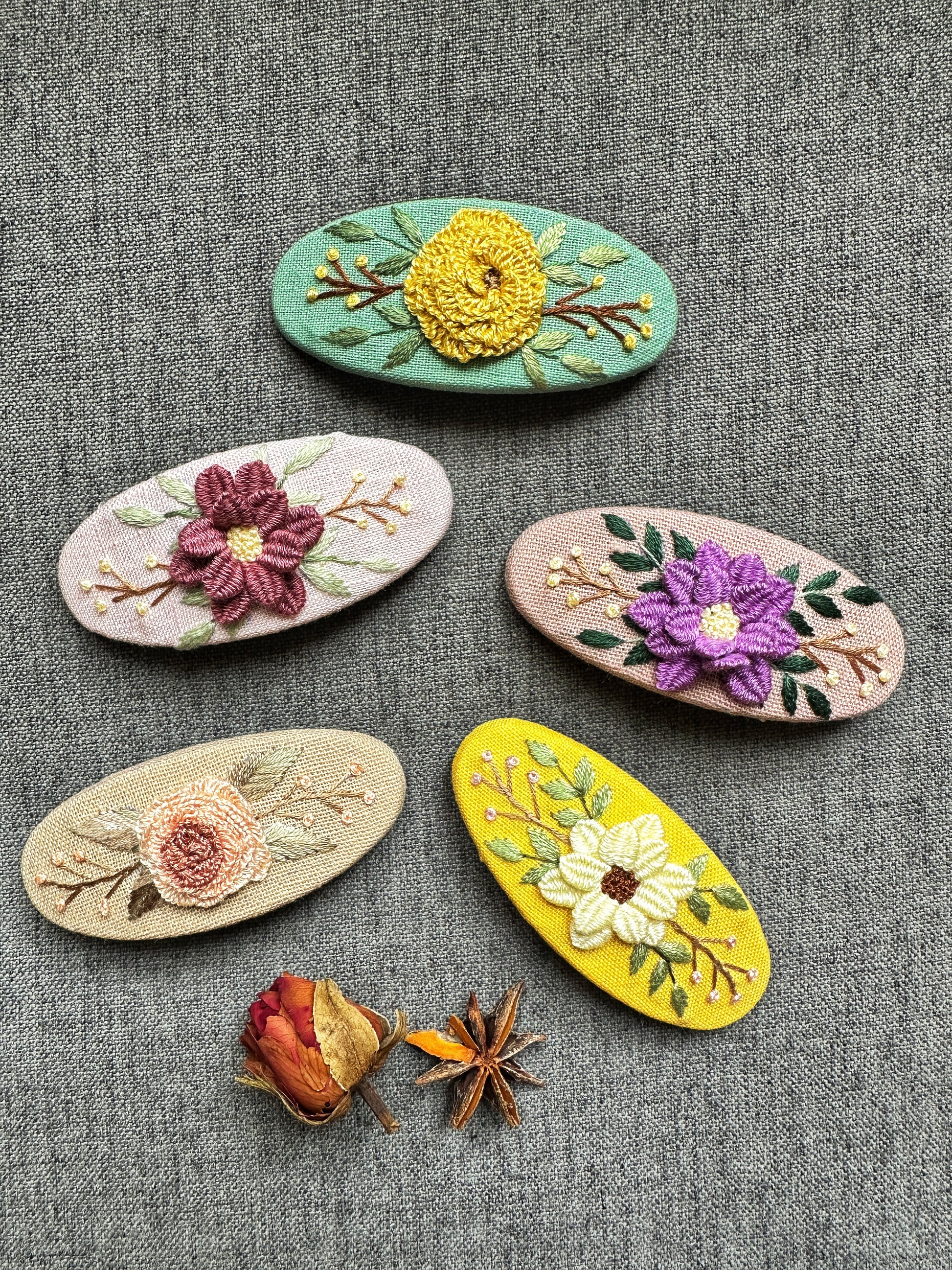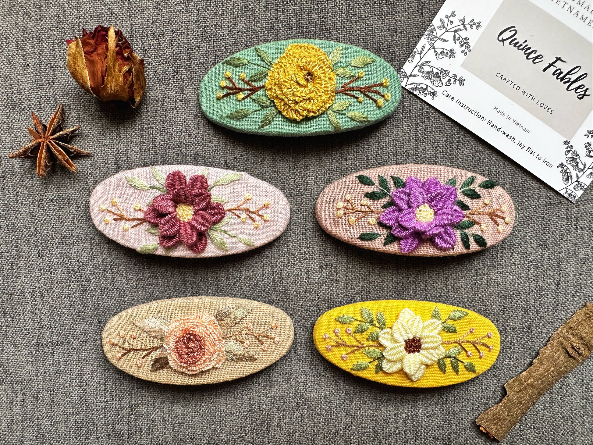 • Each hair clip is hand embroidered on sturdy stainless steel clip.