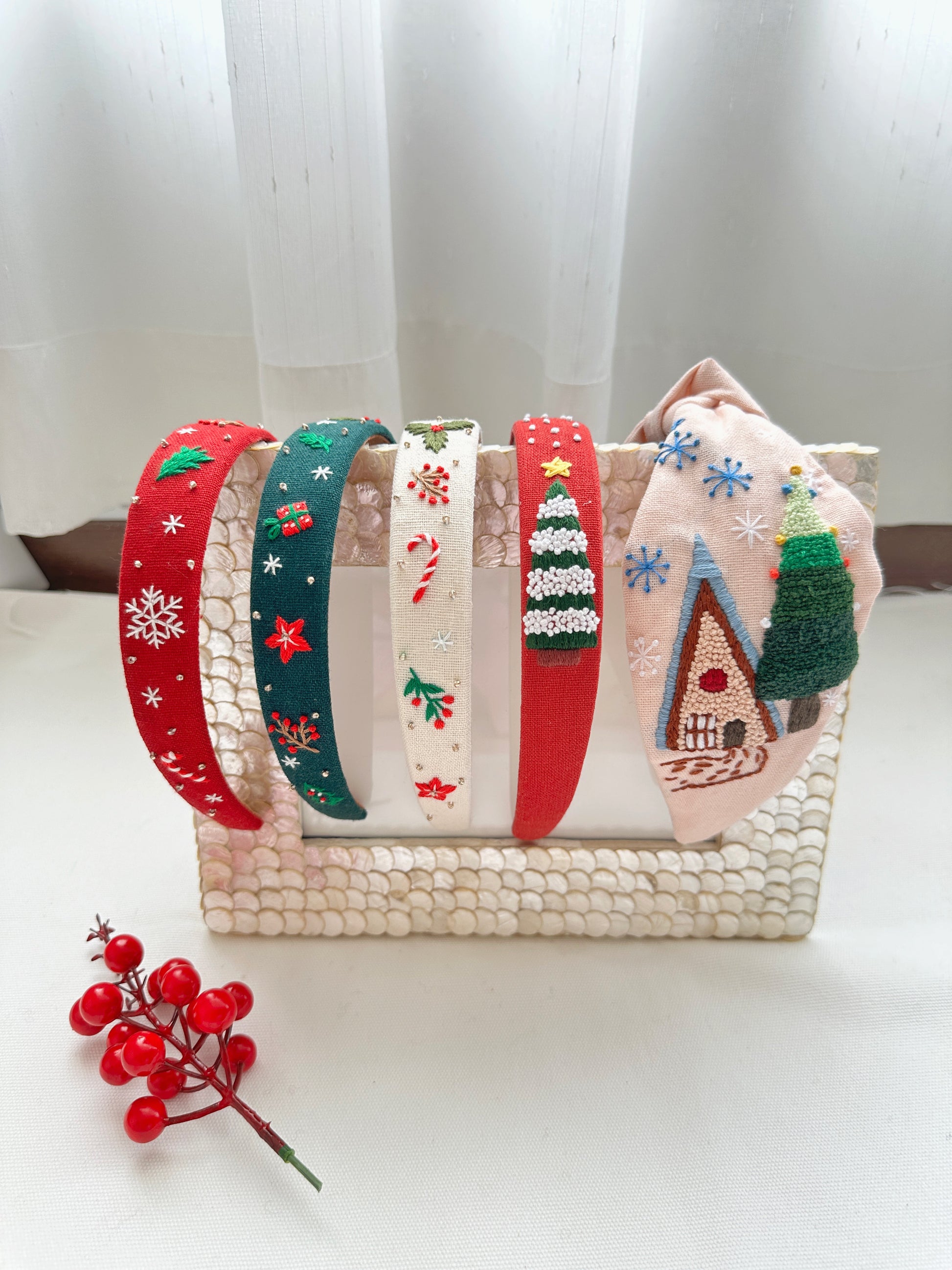 Add some holiday cheer to your wardrobe with this delightful Christmas-themed embroidered headband and turban set! Perfect for getting into the festive spirit, these accessories are hand-embroidered with love and crafted to bring a touch of charm and coziness to your Christmas celebrations.