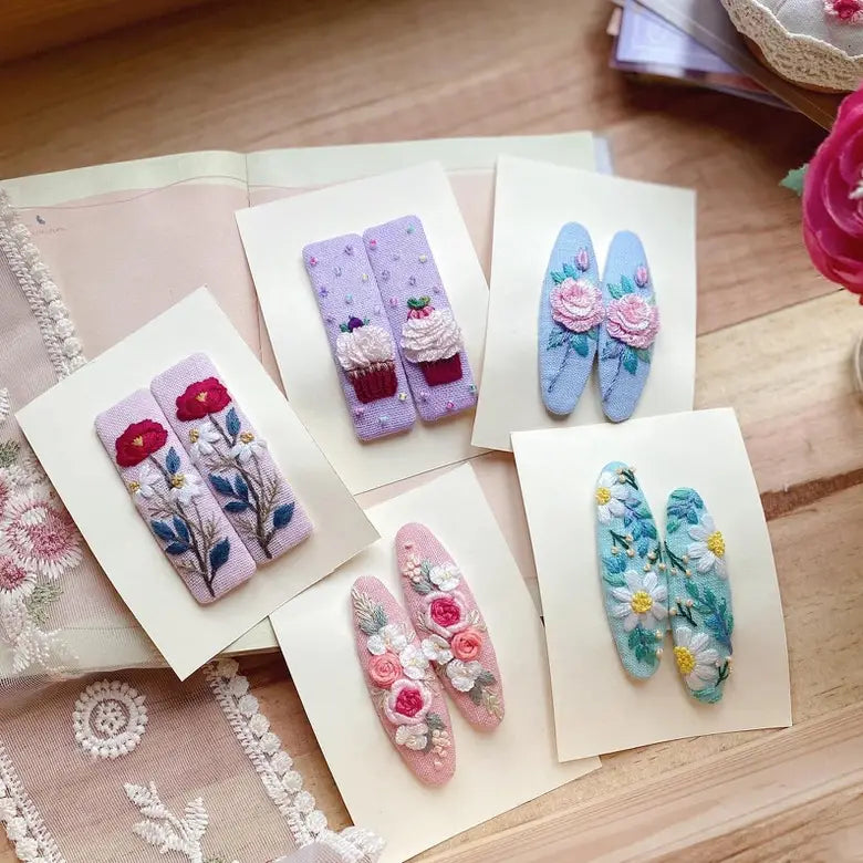 • Each hair barrette is hand embroidered on sturdy stainless steel clip.