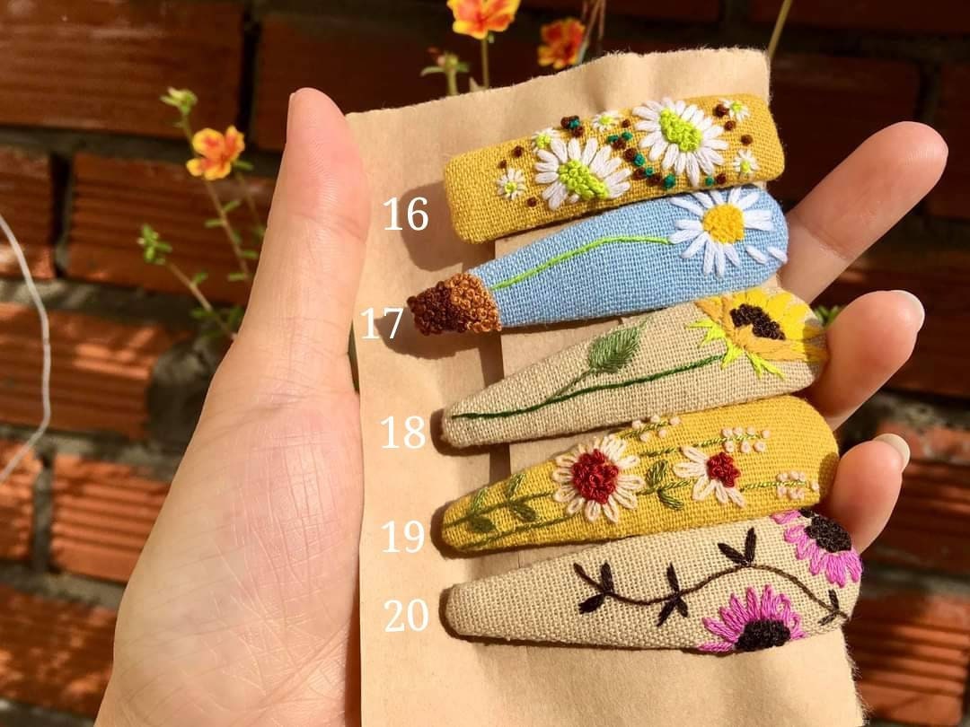 • Each hair clip is hand embroidered on sturdy stainless steel clip.