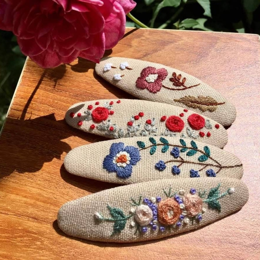 • Each hair clip is hand embroidered on sturdy stainless steel clip.