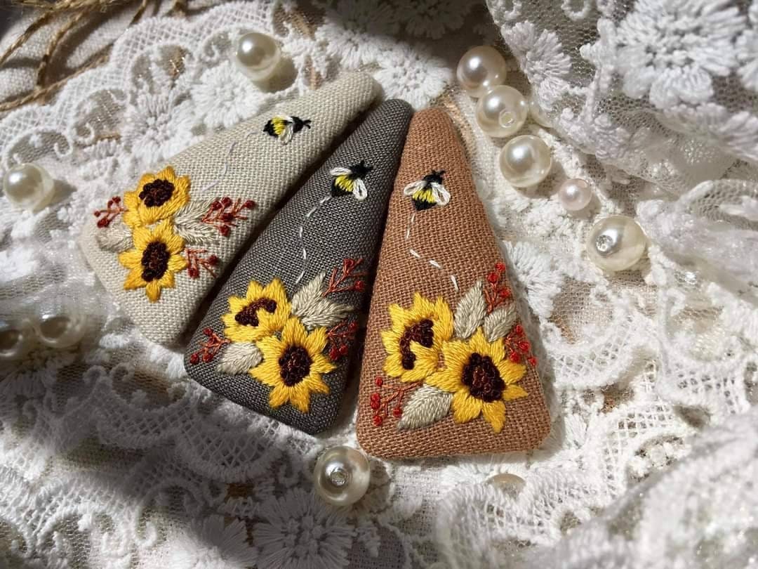 Sunflower & Bee Embroidered Triangle Hair Barrette